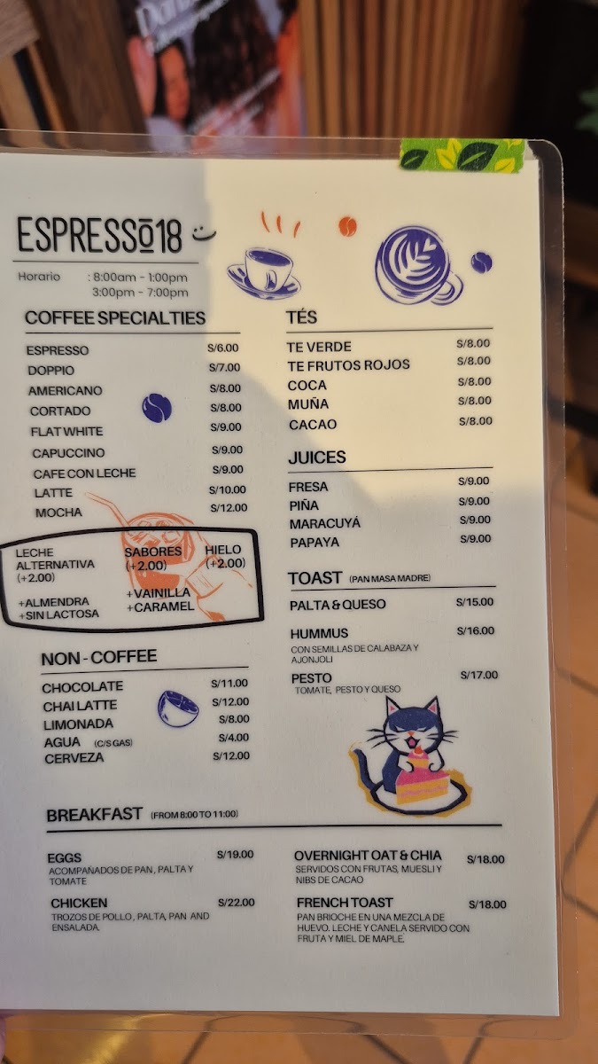 Introducing Espresso 18: Nestled at C. Tandapata 649 in the heart of Cusco, Espresso 18 is a delightful haven for coffee lovers and food enthusiasts alike. This charming coffee shop captivates with its stunning views from the top floor, ideal for unwinding while savoring quality brews.